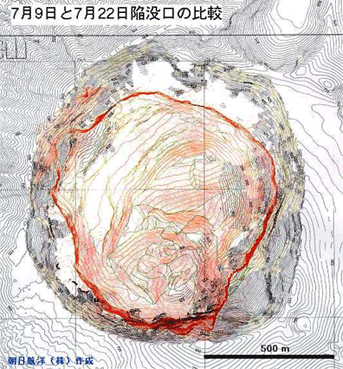 )とを重ね合せた(いずれも朝日航洋(株)の作成)。7月9日には直径約800mで深さ