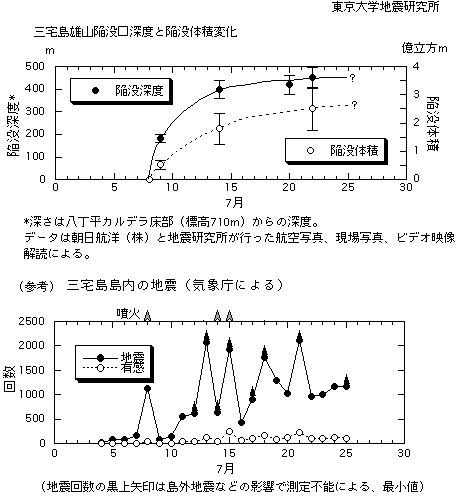 「三宅島雄山陥没口の時間変化(1)」で示したように、陥没口の深度は7月中旬 からほぼ頭打ちになり、陥没口の径が広がってきている。これは地下で成長する空洞 を埋めるように、崩落物が陥没底を充填することによっていると考えられる。この結 果、火口壁が外へ外へと拡大している。今後、火口壁の崩壊は進むと予想されるが、 崩落壁の傾斜には限界があるので、火口底の沈下が急速に進行しない限り、陥没口が 極端に巨大化する可能性は少ない。